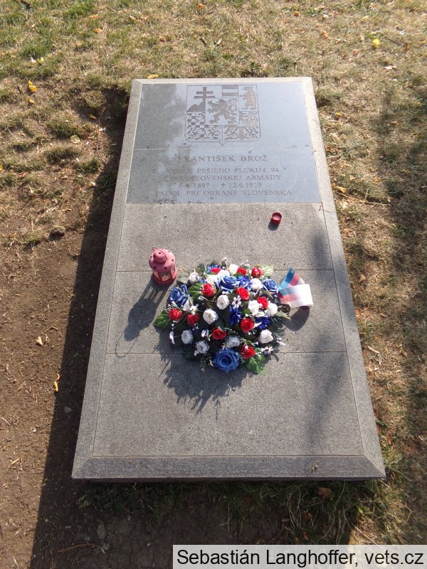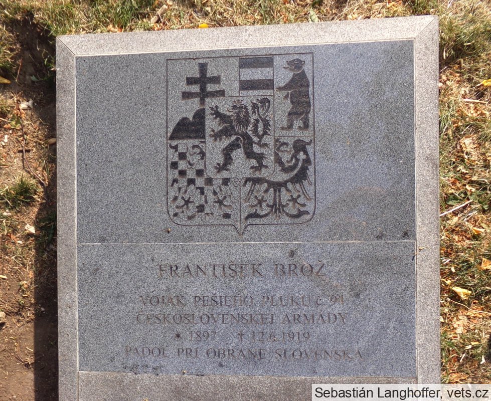 Pred rokom 2015 mal hrob kamennú obrubu a bol označený tabuľou s nápisom: "Neznámy vojak Č.a." V roku 2015 bol hrob mestom Banská Štiavnica obnovený, bola naň však osadená tabuľa s textom: "Neznámy vojak Červenoarmejec - Osloboditeľ". Označenie hrobu bolo však podľa miestnych pamätníkov chybné, nakoľko hrob sa tu nachádzal už pred 2. svetovou vojnou. Po výskume bolo zistené, že v hrobe je pochovaný vojín František Josef Brož (Brosch) z Malej Libiče, ktorý sa narodil 11.12.1897 slobodnej matke Antónii Brožovej. Ten tu bol ranený počas bojov o Slovensko v roku 1919, zraneniam podľahol v nemocnici v Banskej Belej. V roku 2017 preto dochádza k osadeniu nového náhrobku so správnymi údajmi.