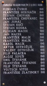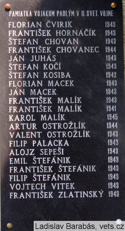 FLORIAN ČVIRIK 1943, FRANTIŠEK HORNÁČIK 1943, ŠTEFAN CHOVAN 1943, FRANTIŠEK CHOVANEC 1944, JÁN JUHÁS 1943, ŠTEFAN KOČÍ 1943, ŠTEFAN KOSIBA 1942, FLORIAN MACEK 1943, JÁN MACEK 1943, FRANTIŠEK MALÍK 1943, FRANTIŠEK MALÍK 1941, KAROL MALÍK 1945, ARTUR OSTROŽLÍK 1944, VALENT OSTROŽLÍK 1943, FILIP PALACKA 1943, ALOJZ SEPEŠI 1943, EMIL ŠTEFÁNIK 1943, FRANTIŠEK ŠTEFÁNIK 1943, FILIP ŠTEFÁNIK 1943, VOJTECH VITEK 1943, FRANTIŠEK ZLATINSKÝ 1943