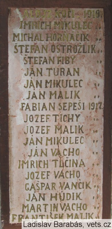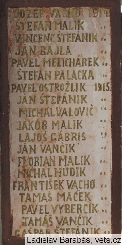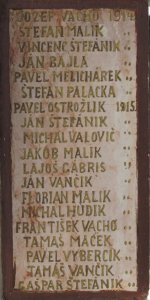 JOZEF VACHO 1914., ŠTEFAN MALIK ", VINCENT ŠTEFÁNIK ", JÁN BAJLA ", PAVEL MELICHÁREK ", ŠTEFAN PALACKA ", PAVEL OSTROŽLIK 1915., MICHAL VALOVIČ ", JAKOB MALIK ", LAJOŠ GÁBRIS ", JÁN VANČIK ", FLORIAN MALIK ", MICHAL HUDIK ", FRANTIŠEK VACHO ", TAMÁŠ MAČEK ", PAVEL VYBERCIK ", TAMÁŠ VANČIK ", GAŠPAR ŠTEFANIK "