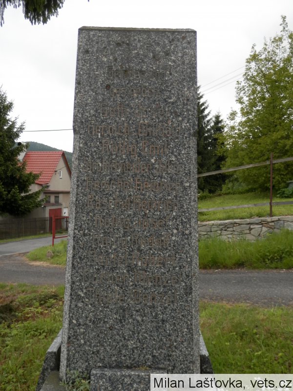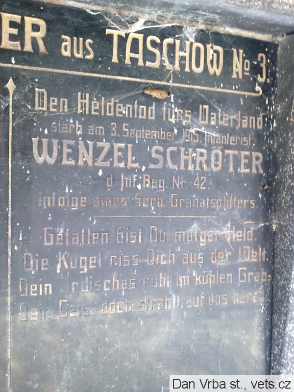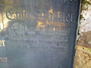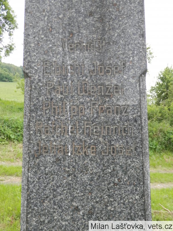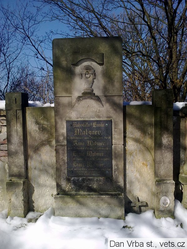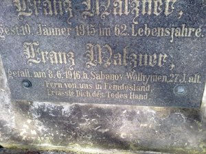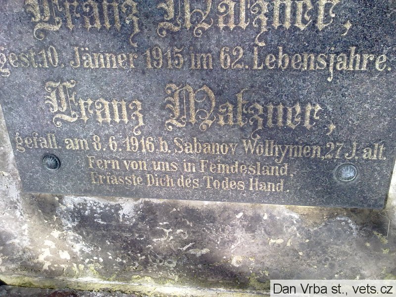 Matzner Franz: *1889 Malschen, okr. Aussig (Malešov, okr. Ústí n/L). LstInft., IR. Nr. 42. Padl 8.6.1916 Sopanov (na kenotafu chybně Sabanov). Tamtéž následujícího dne pohřben. Sopanov dnes Sapaniv, Ukrajina.
