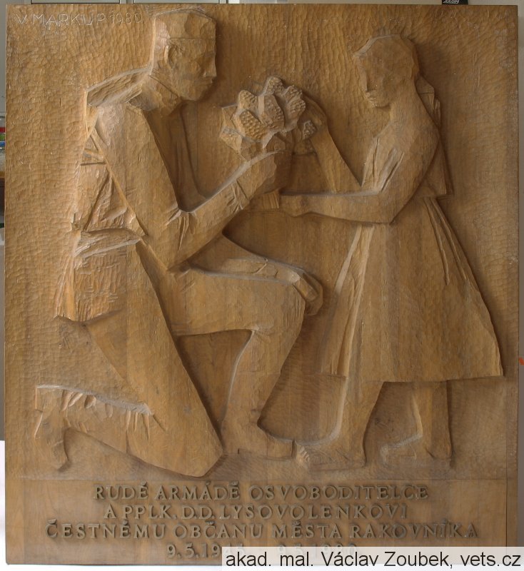 Bronzovodřevěná plastika poděkování Rudé armádě a sovětskému veliteli podplukovníku Dmitriji Dmitrijeviči Lysovolenkovi byla odhalena v budově radnice v roce 1980. Jejím autorem je akademický sochař a řezbář Václav Markup. Po roce 1989 bylo pietní místo zrušeno a dnes se plastika nachází v depozitáři Rabasovy galerie v Rakovníku.