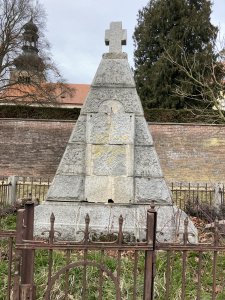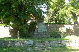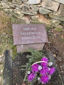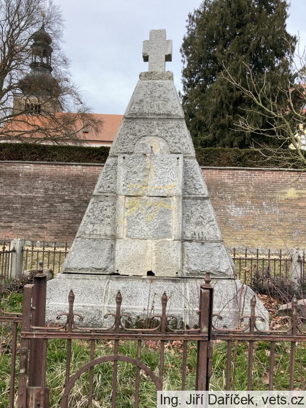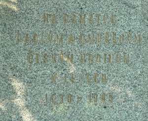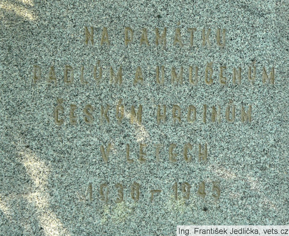 Na návsi pod zdí areálu zámku postavili po první světové válce Němci svým padlým památník. Také tento pylon se po příchodu českého obyvatelstva proměnil, stejně jako řada jiných, v objekt odrážející změněnou společenskou situaci. Text na nové desce upevněné na kamenném jehlanu vyjadřuje pietní úctu a díky všem Čechům, kteří v průběhu druhé světové války položili své životy.