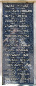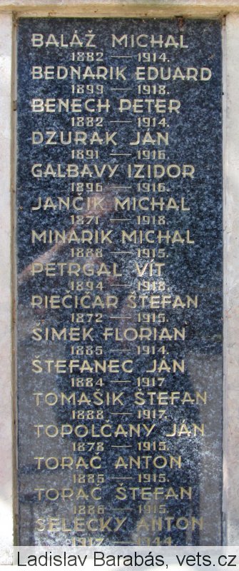 BALÁŽ MICHAL 1882-1914. BEDNARIK EDUARD 1899-1918. BENECH PETER 1882-1914. DZURAK JÁN 1891-1916. GALBAVÝ IZIDOR 1896-1916. JANČIK MICHAL 1871-1918. MINÁRIK MICHAL 1888-1915. PETRGAL VÍT 1894-1918. RIEČIČAR ŠTEFAN 1872-1915. ŠIMEK FLORIAN 1885-1914. ŠTEFANEC JÁN 1884-1917. TOMÁŠIK ŠTEFAN 1888-1917. TOPOLČANY JÁN 1878-1915. TORAČ ANTON 1885-1915. TORAČ ŠTEFAN 1886-1915. SELECKY ANTON 1917-1944.