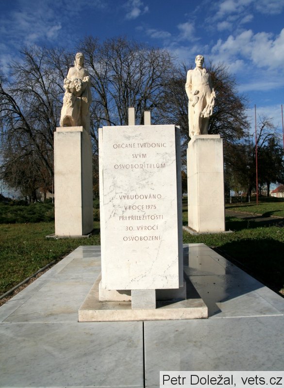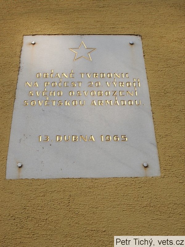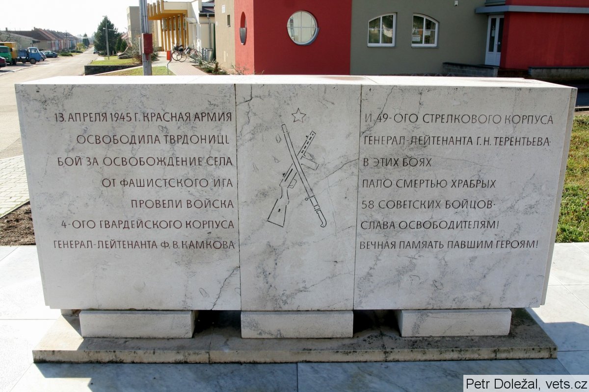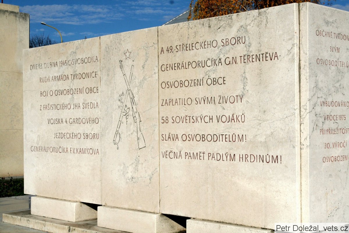 DNE 13. DUBNA 1945 OSVOBODILA RUDÁ ARMÁDA TVRDONICE. BOJ O OSVOBOZENÍ OBCE Z FAŠISTICKÉHO JHA SVEDLA VOJSKA 4. GARDOVÉHO JEZDECKÉHO SBORU GENERÁLPORUČÍKA F. V. KAMKOVA A 49. STŘELECKÉHO SBORU GENERÁLPORUČÍKA G.N.TĚRENTĚVA.