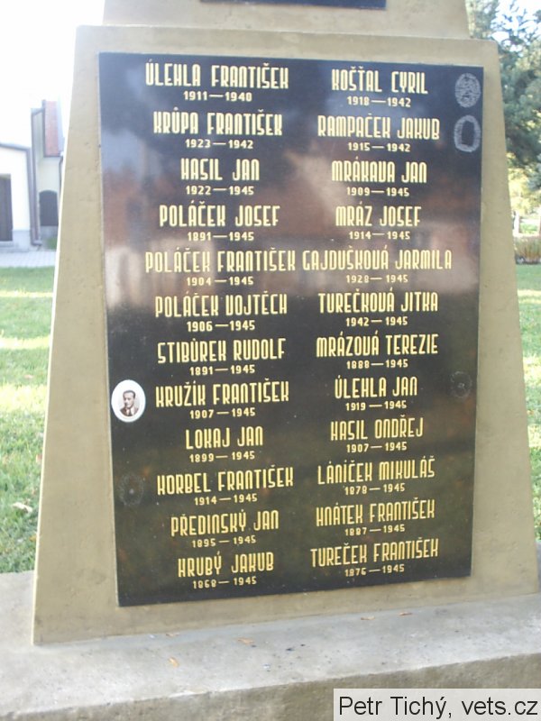 5. Úlehla František, čp. 270. Na práci v Berlíně. Zatčen a umučen ve vězení. Zanechal vdovu a dvě děti. Jeho bratr Úlehla Jan, svobodný, zabit při bombardování Lince.