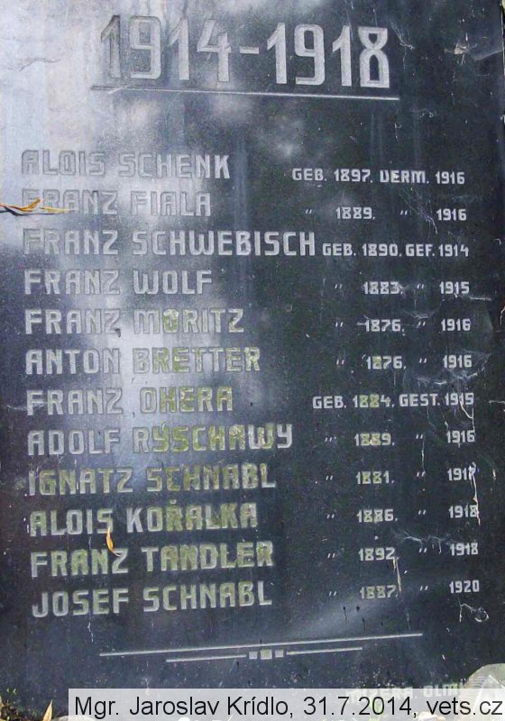 Kořalka Alois, hodnost a pluk-vojín 54. p.pl., *1886, místo narození-Nedvězí, Olomouc, Morava, †12.10.1918, místo úmrtí a pohřbení-Sejmeni, v Albánii, opsáno podle-matr. 54.p.pl., u Z.V.V. Brno, úmrtní kniha: tom., fol. I. - 11.;
