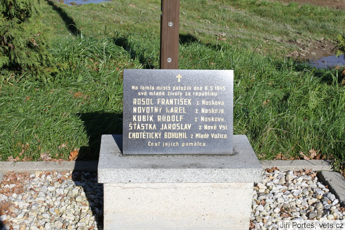 V květnu 1945 do Mladé Vožice dorazil neúřední telegram, který oznamoval konec války. Celé město slavilo mír, třebaže ještě v okolí Tábora, Pacova a Vlašimi byli ještě Němci. Lidé se snažili rychle zapomenout na prožité hrůzy. V Nové Vsi byli zadrženi němečtí vojáci. Když byli odzbrojeni, dostali civilní šaty a byli propuštěni. Němci vtrhli do Nové Vsi, kde zastřelili tři muže a ostatní odvezli do Votic, kde je celou noc a den týrali. Někteří mladíci z Noskova byli zvědaví a chtěli vědět, co se v Nové Vsi stalo. Přiblížili se tedy k silnici vedoucí z Nové Vsi do Mladé Vožice. Tam je zastihli esesmani, zastřelili je a vše, co měli u sebe, jim sebrali.