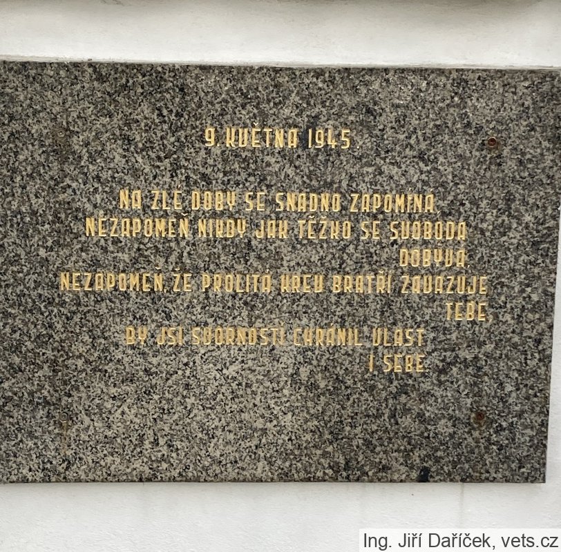 "Na MNV bylo jednáno o tom, že by bylo třeba k 1. výročí našeho osvobození postaviti v obci nějaký památník na osídlení s nápisem, který by připomínal nám i všem, kteří přijdou po nás, že byla těžká doba, kterou ti, kteří pomník stavěli, museli prožíti. Bylo všem občanům oznámeno, by podali návrh na nápis na tento památník. Návrhů bylo podáno několik a jako nejlepší byl přijat návrh podaný Emilem Čampulou. Tento památník byl odhalen v den prvého výročí osvobození naší vlasti dne 9. května 1946 za přítomnosti členů ONV ze Stříbra, za účasti jedné roty vojenské posádky ze Stříbra a za velké účasti občanů z celého okresu. Slavnost odhalení zahájil předseda MNV tím, že dal po vystoupení na tribunu pokyn připraveným běžcům, aby donesli připravený věnec na hřbitov do Erpužic a tam jej položili na hrob neznámého ruského vojína, který byl u nás nalezen. Běžci vyběhli a po celou dobu, než běžci zašli za první ohyb silnice, stáli všichni účastníci v naprostém klidu, aby vzdali čest muži, který byl příslušníkem toho národa, který dal největší oběti na lidských životech za naše osvobození. Teprve potom zahájil slavnost, která se odbývala celá venku až dlouho do noci. Slavnost, která dala členům národního výboru hodně starostí, se vydařila."