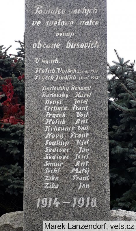 Umístění: Bušovice, ve středu obce mezi rybníkem a zámkemNápis:
