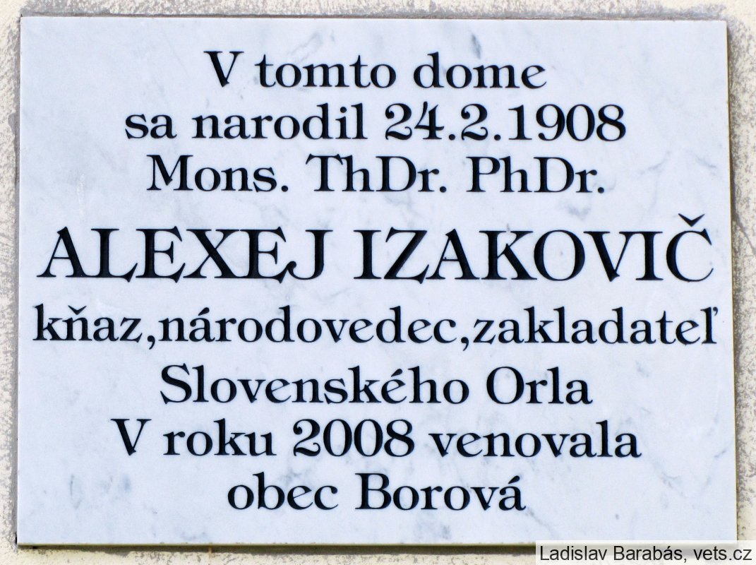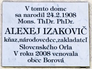 Alexej Izakovič (24.2.1908 Borová – 30.10.1995 Bratislava) priekopník kresťanského telovýchovného hnutia na Slovensku, trpiteľ za vieru. Za kňaza ho vysvätili v Olomouci 3.7.1932. V roku 1943 sa zaslúžil o záchranu dvadsiatich utečencov z ruského zajatia. Po potlačení povstania nepodpísal osvedčenie o poslušnosti vláde a zbavili ho všetkých funkcií. Od septembra 1947 bol jeden rok vo vyšetrovacej väzbe. V roku 1950 ho zbavili občianskych práv a väznili ho v Bratislave, Leopoldove a Ilave až do augusta 1953. Bol určený na prácu v ostravských alebo nováckych baniach, pre zlý zdravotný stav sa nakoniec zamestnal v Trnave ako pomocný robotník. Počas tzv. normalizácie v roku 1970 mu odobrali štátny súhlas. Rehabilitovaný bol v roku 1972.