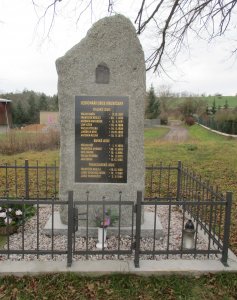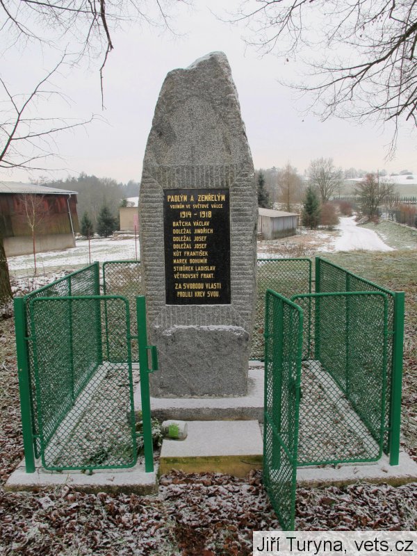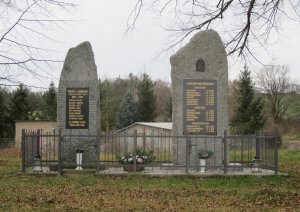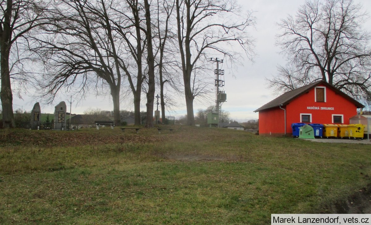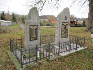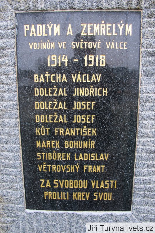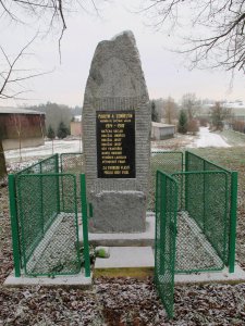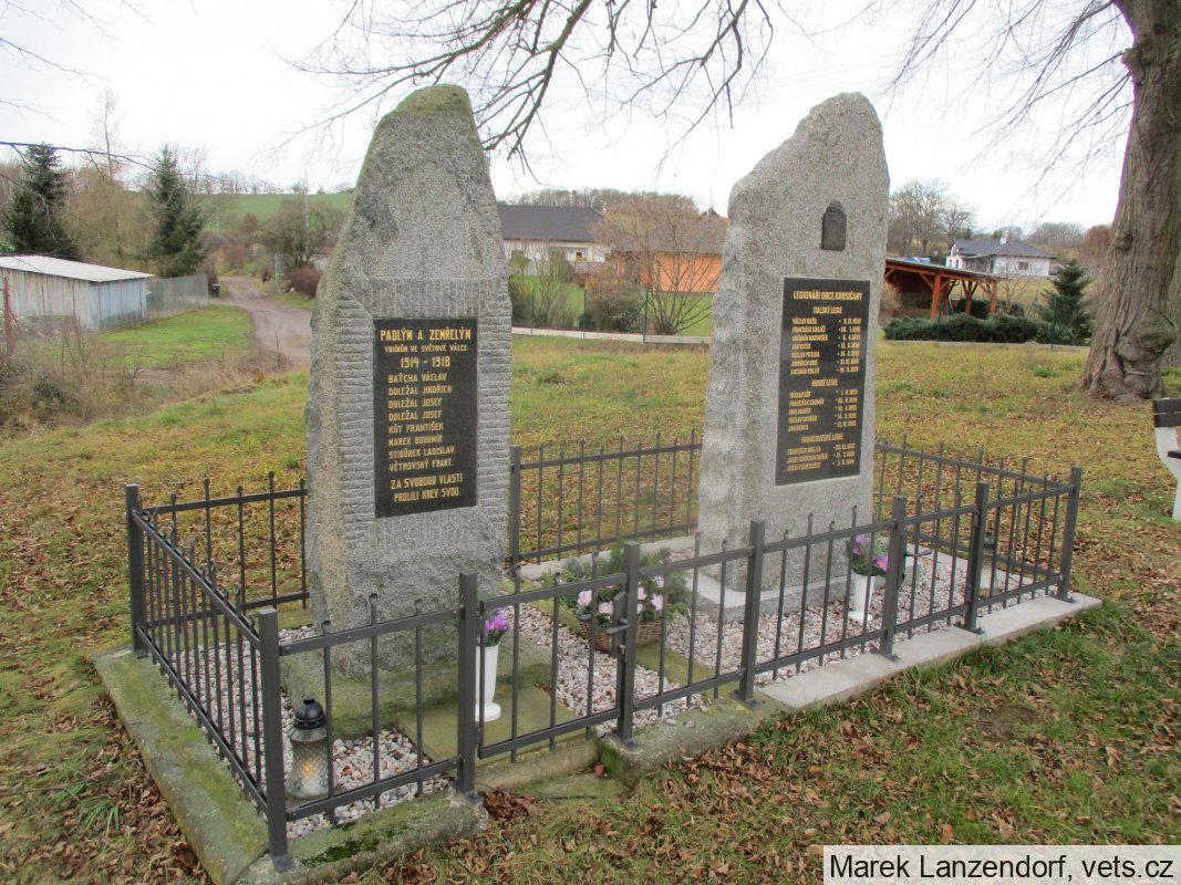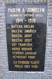 Pomník padlým a zemřelým ve světové válce (levý žulový pylon) vznikl v r. 1925 na návrší vedle hasičské zbrojnice a autobusové zastávky díky zdejšímu hasičskému sboru.
