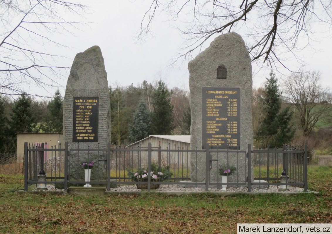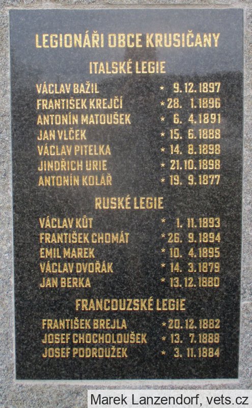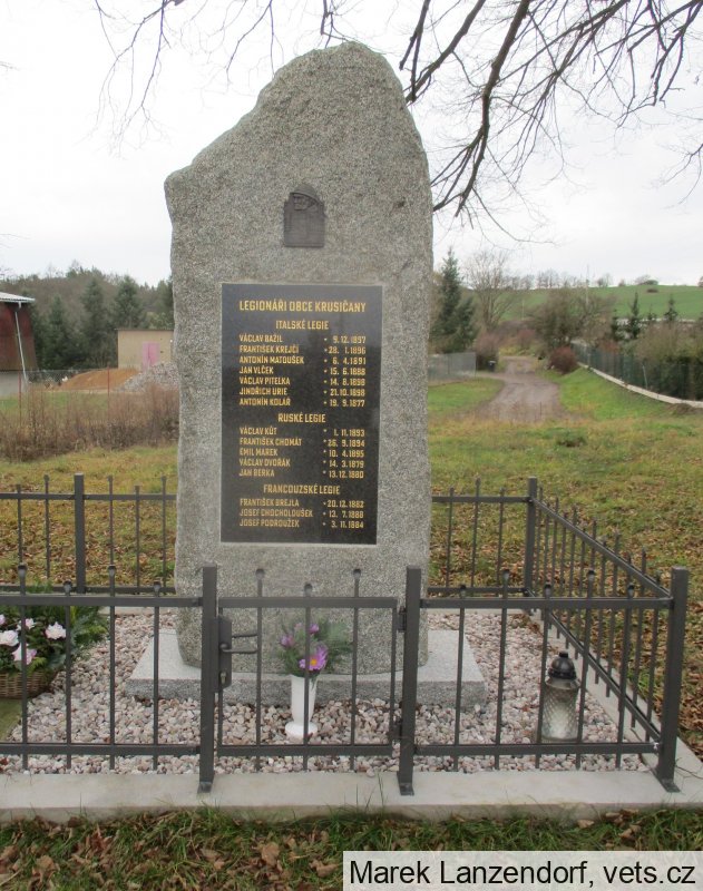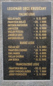 Na památku legionářů, kteří během první světové války bojovali v legiích v Rusku, Francii a Itálii za vznik samostatného Československa, odhalil nový pomník (pravý žulový pylon) v roce 2019 Mgr. Martin Kadrnožka, starosta Týnce nad Sázavou, v Krusičanech. Autor, kameník a sochař Roman Lutz, ho velice dobře zapasoval k vedlejšímu pomníku padlým v 1. sv. válce. O jeho realizaci požádal vedení města krusičanský osadní výbor. Legie měly celkem přes 140 000 dobrovolníků a prokazatelně 15 z nich se narodilo, nebo žilo v Krusičanech. Ve spolupráci s Československou obcí legionářskou byl vypracován jejich jmenný seznam.
