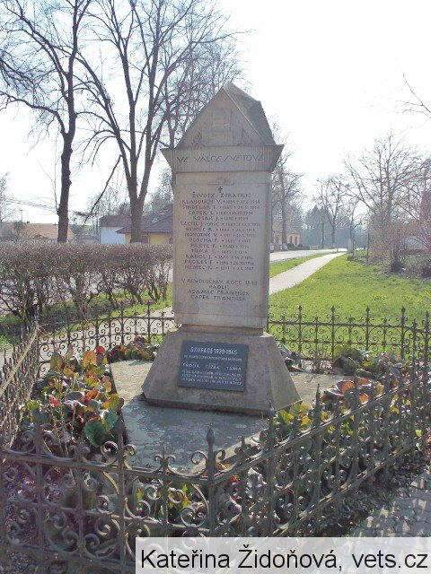 Pomník postaven budějovickým sochařem J. Skřivánkem. Odhalen byl 10.6.1923 a posvěcen katechetou Čapkem. U pomníku umístěna láhev od piva, ve které je plakát zvoucí na odhalení pomníku s podpisy členů kroužku, který se zasloužil o jeho vybudování. Pomník je jedinečný tím, že na něm jsou nejen oběti 1. sv. války, ale i válek husitských a války třicetileté. Později byl ještě doplněn o desku se jmény zemřelých za nacistické okupace.