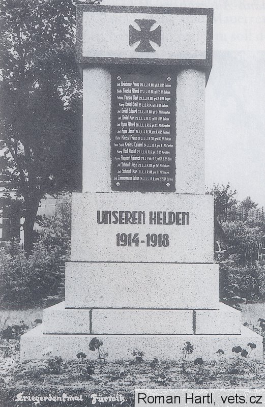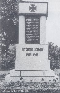 Pomník byl slavnostně odhalen v roce 1925. Slavnost se konala současně s oslavou 25. výročí založení hasičského sboru. Pomník postaven na místě zbořené obecní pastoušky. Pomník zhotoven podle návrhu Dipl. Ing. Oskara Miksche kamenickou firmou ze Stebna. Podle vzpomínek Franze Kreissla bylo na pomníku 14 jmen a rovněž tabulka se jmény prvních obětí druhé světové války. Při slavnosti se dopoledne konala bohoslužba a odpoledne beseda s hudbou ve velkém sadu sedláka Rödla. Publikace Heimatkreis Podersam-Jechnitz in Bildern uvádí, že pomník byl slavnostně odhalen 17. 7. 1932. Po skončení války byl novodosídlenci zničen, podle uvedené publikace k tomu došlo při národní slavnosti 28. 10. 1945, kdy měl být pomník stržen traktorem. (zdroj http://www.rakovnickesudety.cz/ ) Údaje k některým jménům: