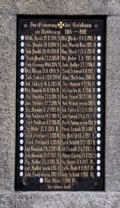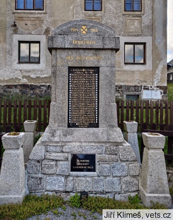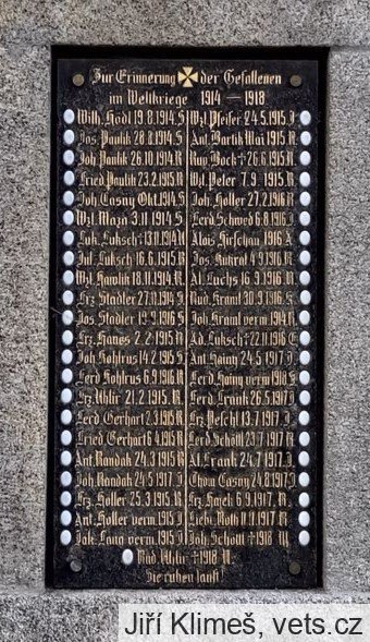 Seznam obětí dle portálu CEVH MO ČR (jména jsou často nepřesná a nepravděpodobná, data z pomníku neúplná): Joh. Albrecht, 1915, Ant. Bártík, květen 1915, Vizl Bartik, 26.11.1917, Rup. Bock, 26.6.1915, Ant. Bumischern, 16.2.1916, Mil. Farolik, 18.11.1914, Friz. Fones, 2.2.1915, Alois Frank, 24.7.1917, Ferd. Frank, 26.5.1917, Alois Fuchs, 16.9.1916, Fuk Fuksch, 13.11.1914, Jul. Fuksch, 16.6.1915, Chom. Gasng, 24.8.1919, Johan Gasny, říjen 1914, Ferd. Gerhart, 2.3.1915, Ferd. Gerhart, 6.4.1915, Frabr Grabmüller, 1914, Ferd. Haiy, 1918, Friz. Hajek, 6.9.1917, Ad. Hajng, 24.5.1917, Halnberger, září 1915, Alois Hirtchan, 1916, Mihl Hödl, 19.8.1914, Ant. Holler, 1915, Friz. Holler, 25.3.1915, Johan Holler, 27.2.1916, Mar. Koftner, 1917, Ferd. Kohlrus, 6.9.1916, Johan Kohlrus, 14.2.1915, Joh. Kraml, 22.11.1914, Rup. Kraml, 30.9.1916, Al. Kubizak, 25.5.1915, Jos. Kuksch, 4.9.1916, Jak. Lang, 1915, Friz Matějka, 15.5.1915, Friz. Matejka, 16.6.1917, Mar. Matějka, 18.8.1916, Mzl Matejka, 1.4.1918, Wil. Moza, 3.11.1914, Jos. Nowotny, 20.2.1918, Juk. Nowotny, 15.8.1916, Pius Nowotny, 3.1.1915, Mzt. Pater, 7.9.1915, Fried Paulik, 23.2.1915, Johan Paulik, 26.10.1914, Josef Paulík, 28.8.1914, Mzl. Pfaifer, 24.5.1915, Ad. Pimiskarn, 26.11.1917, Ant. Randák, 24.3.1915, Johan Randák, 24.5.1917, Feiger Roth, 11.11.1917, Salbitzka, 18.8.1916, Ferd. Schattl, 29.7.1917, Ferd. Schmed, 6.8.1916, Joh. Schöttl, 1918, Mart. Schraib, květen 1918, Fritz Stadler, 27.11.1914, Jos. Stadler, 19.9.1916, Ant. Stogbauer, 1915, Friz Stogbauer, 1914, Friz. Uhlir, 21.2.1915, Rud. Uhlíř, 1918, Friz. Welchl, 13.7.1917, Folef Woldrich, březen 1915, Friz. Jos. Woldrich, 5.1.1917