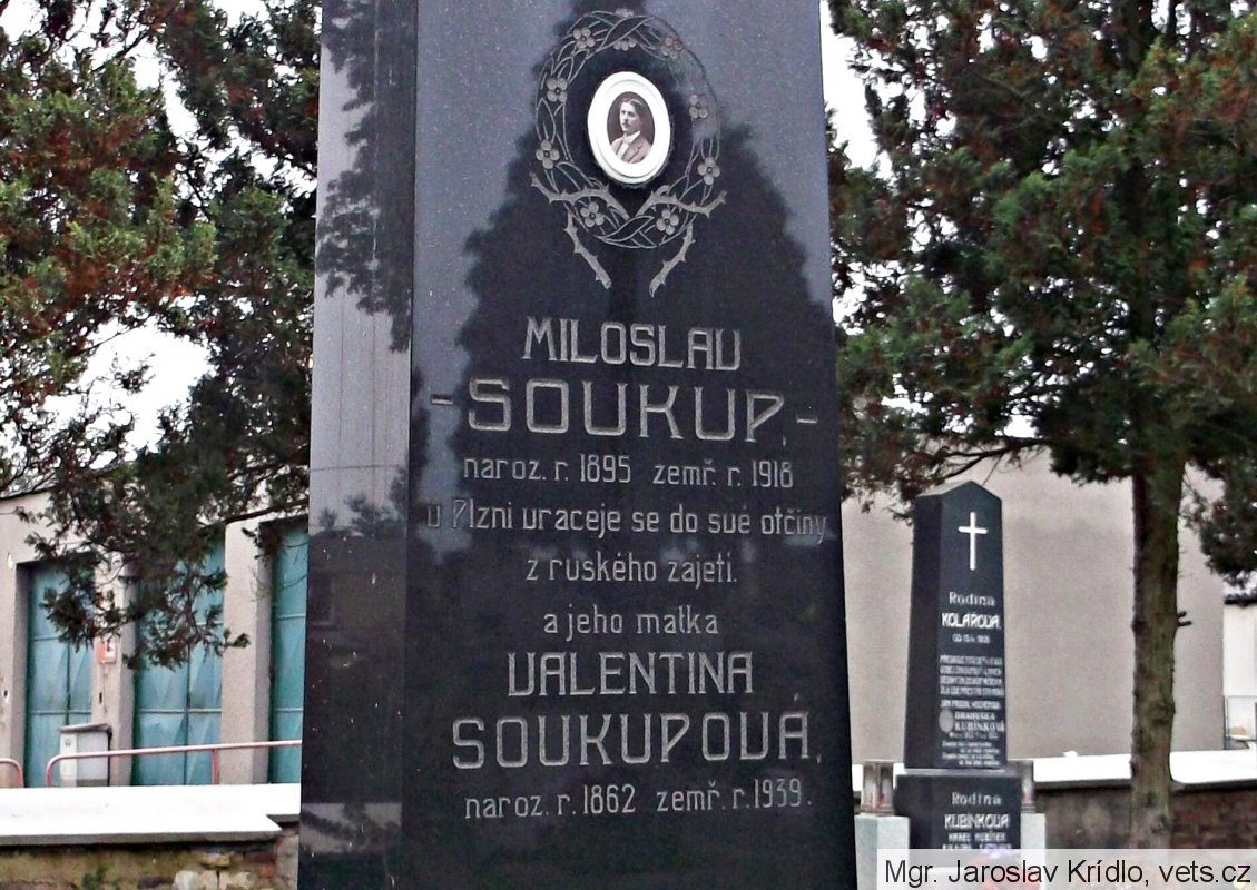 Soukup Miloslav, hodnost-vojín, bývalého 7. střeleckého pluku, *1894, místo narození-Mutějovice, okr. Rakovník, Čechy, příslušnost-tamtéž, †2.12.1918, místo úmrtí-v býv. zál. nem. č. 2 Plzeň, Čechy, datum pohřbu-8.12.1918, místo-na hřbitově v Mutějovicích, okr. Rakovník, Čechy, opsáno podle-matriky býv. zál. nem. č. 1 Plzeň, uložené u velit. 2. divise-katol. duchovní správy, úmrtní knika - tom. III. fol.121;