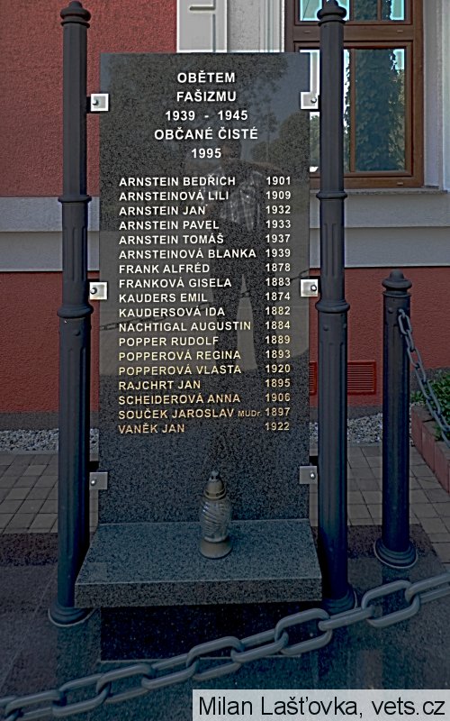 Pamětní deska osazena na budově nové školy. Uvedena již v publikaci Kříže, sochy, pomníky, pamětní desky a jiné památky v městě Čisté a okolí od Václava Korba. V této knize uveden stav památek k roku 1975.