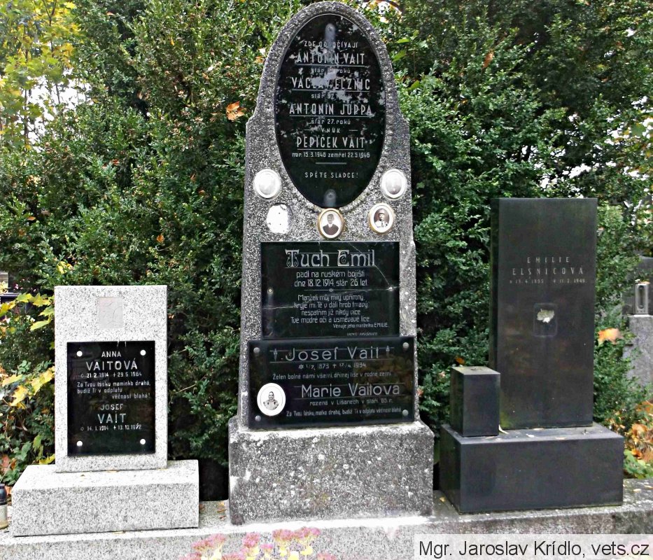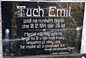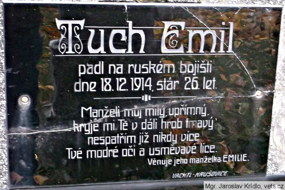 Tuch Emil, *1888, místo narození-Podbořany, okr, Podbořany, domovem-Krušovice, okr. Rakovník, †18.12.1914, příčina úmrtí-padl, ruské bojiště-severní fronta, poznámka-desátník v zál., pěší pluk 38;