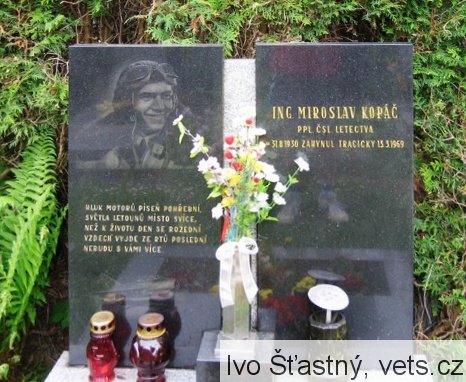 Pilot Miroslav Kopáč zahynul 13.3.1969 při letecké nehodě u obce Praskačka v okr. Hradec Králové.