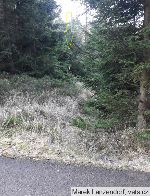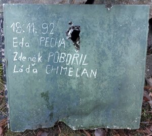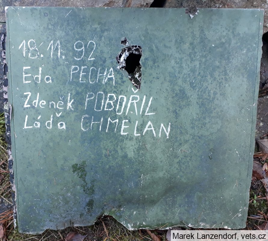 Umístění: Malá Víska, dopadová plocha Jordán, cca v polovině vzdušné vzdálenosti hory Houpák a hory Jordán, cca 20 metrů od cesty směr západNápis: