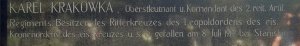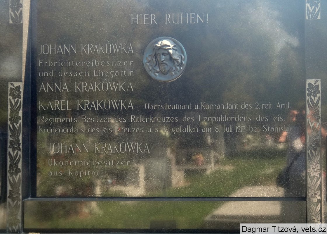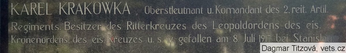 KAREL KRAKOWKA, podplukovník a velitel 2. regimentu jízdního dělostřelectva. Nositel Rytířského kříže Leopoldova řádu, Řádu Železné koruny, Železného kříže a.t.d. padl 8. července 1917 u Stanislavi (dnes Ivano- Frankovska, Ukrajina)