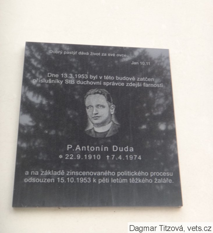 Antonín Duda (1910–1974) byl po studiu bohosloví v Olomouci v roce 1940 vysvěcen na kněze. Působil jako duchovní správce farností olomoucké arcidiecéze, v letech 1947–1953 pak ve Starém Bohumíně. Zde byl 13. března 1953 zatčen a poté 15. října téhož roku v zinscenovaném politickém procesu vedeném ostravským soudem odsouzen k pěti letům žaláře, který odpykával ve Valdicích a od září 1954 v pracovním táboře ve Rtyni v Podkrkonoší. K jeho zatčení přispěla výpověď bývalého spolužáka, který byl zadržen při přechodu hranic s finančním obnosem, jež mu páter Duda poskytl. Po propuštění v roce 1958 pracoval v jáchymovských dolech a později jako údržbář. Souhlas k výkonu duchovenské činnosti získal P. Duda v roce 1966. Plně rehabilitován byl v roce 1991.