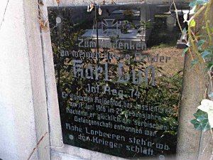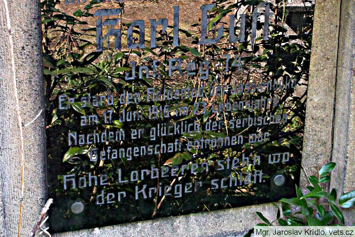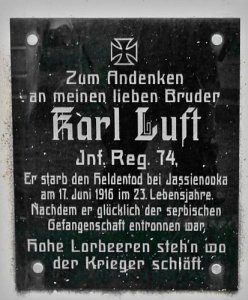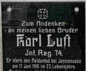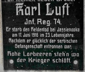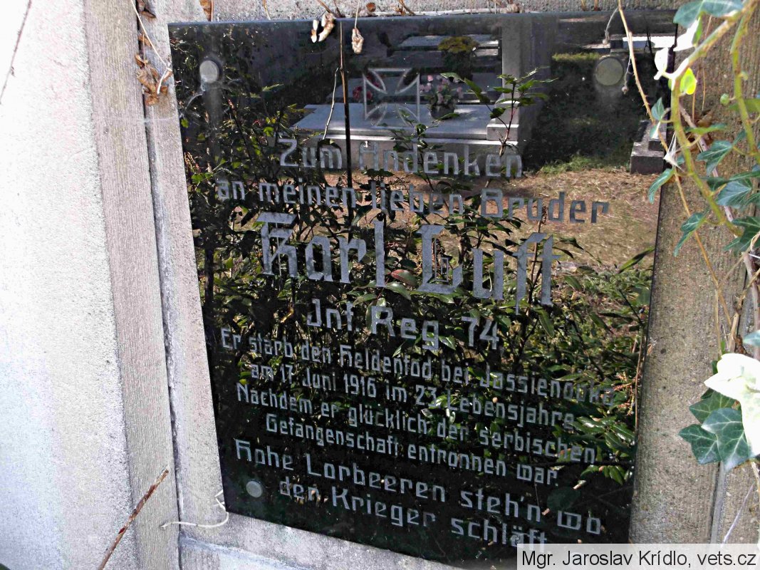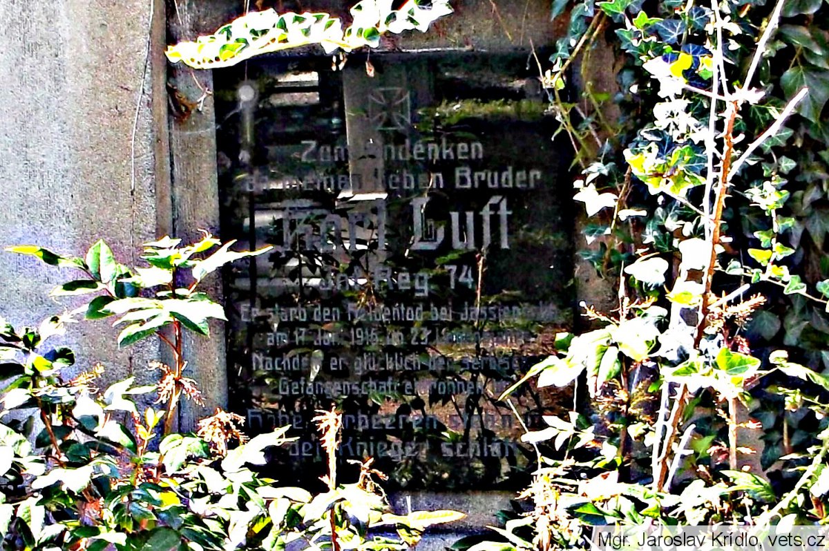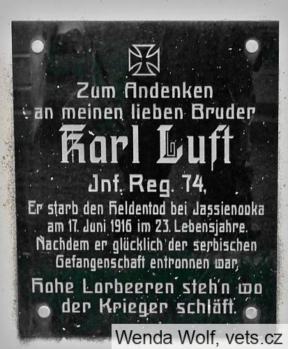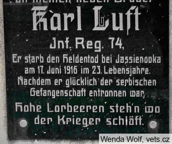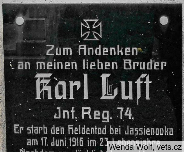 Luft Karel *1893, hodnost-vojín, 74. pěší pluk, místo narození-Hohenstein, okres Aussig (Ústí n/L), Čechy, příslušnost-Marschen (Maršov), okres Aussig, Čechy, †17.6.1916, místo úmrtí-Jasienowka, guv. Volhynie, Rusko, datum pohřbu-17.6.1916, označení hřbitova a místo-tamtéž, opsáno podle-matriky p. pl. 22; (zdroj: http.//vuapraha.cz/ )