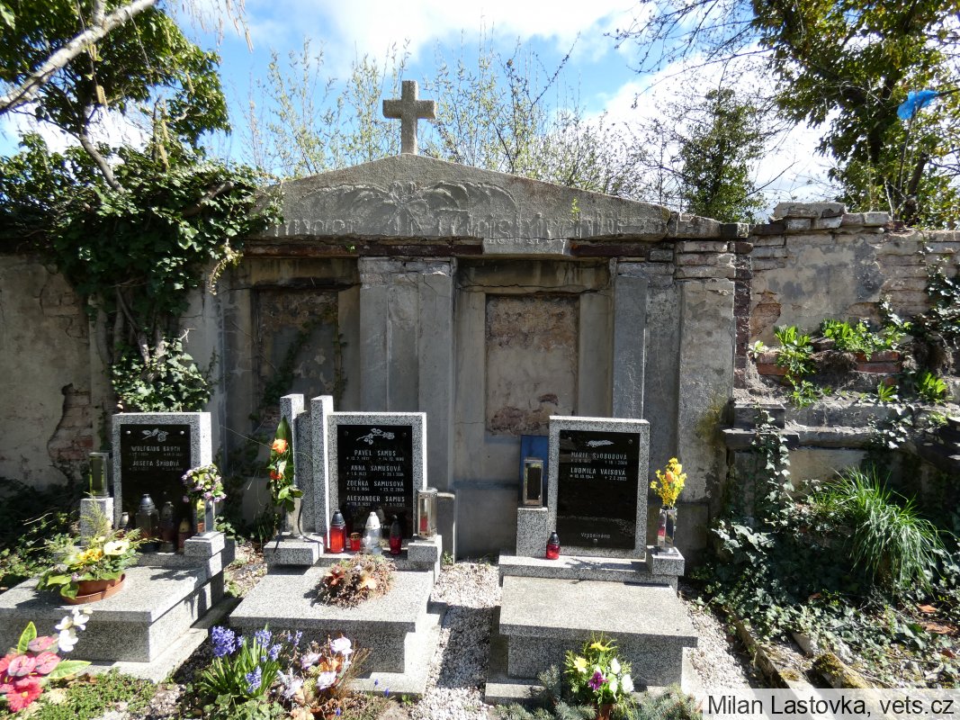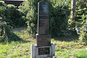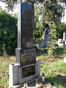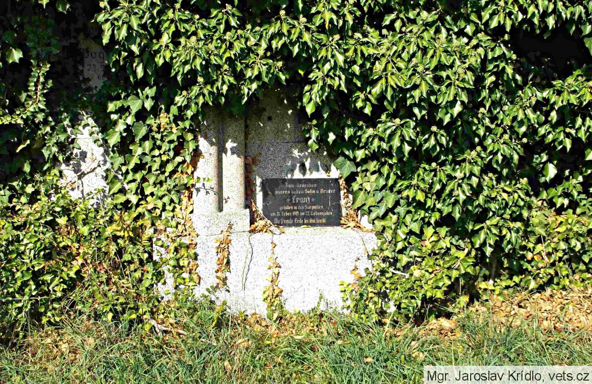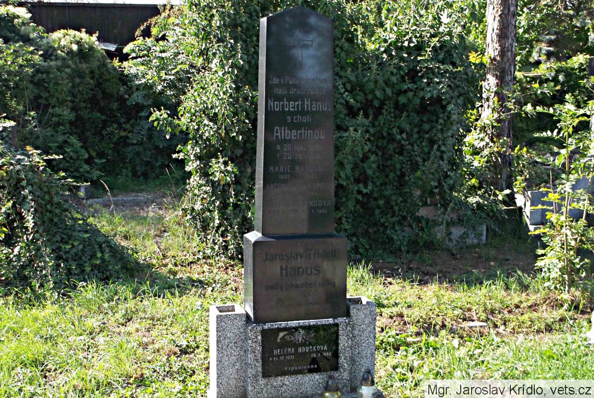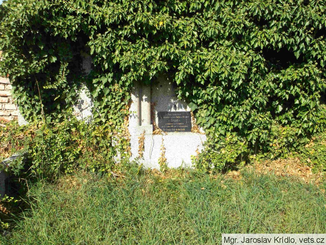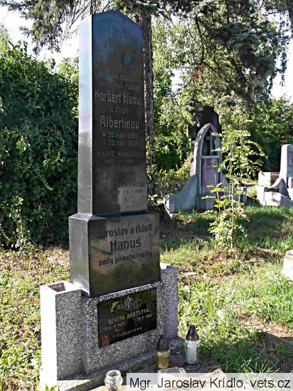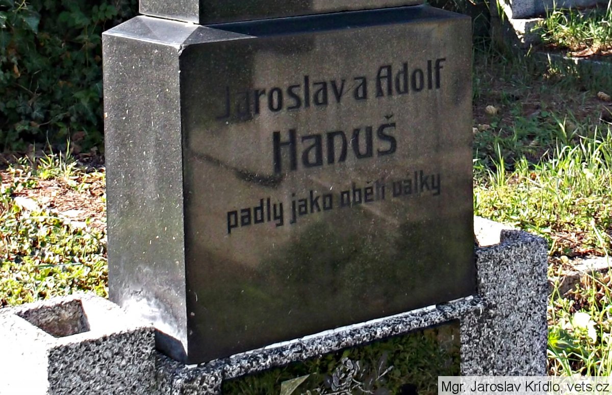 Pravděpodobně kenotaf obětí první světové války; Hanus Adolf *1883, místo narození-Vídeň, Rakousko, domovem-neuvedeno, hodnost-vojín 8. pěšího pluku, †6.9.1915, místo úmrtí-Karbytów, Rusk. Polsko, datum a místo pohřbu-6.9.1915 Karbytów. (zdroj databáze http://vuapraha.cz/ ); nápis s gramatickou chybou.