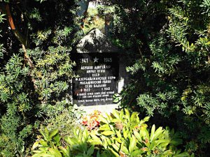 Podle přilby Wehrmachtu ověnčené vavřínovým věncem lze usoudit na padlého vojáka 2. světové války (pak by to byl pravděpodobně kenotaf).