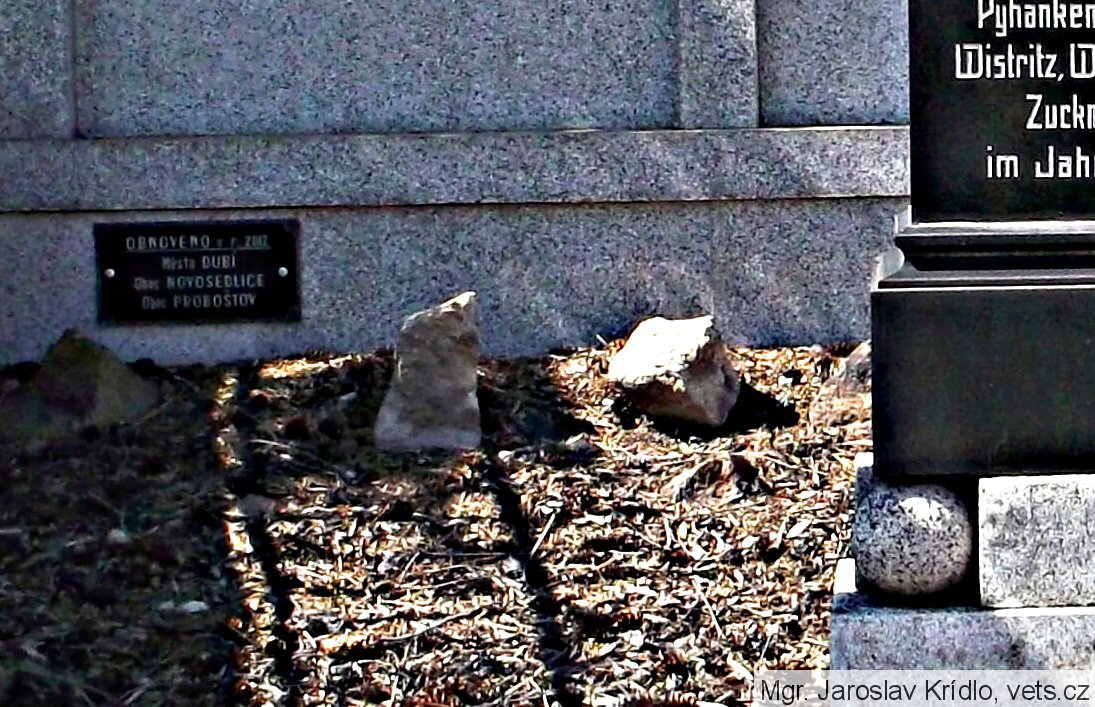 na obvodovém zdivu pomníku, vlevo dole, umístěna informační deska s textem: Obnoveno v r. 2012, Město Dubí, Obec Novosedlice, Obec Proboštov