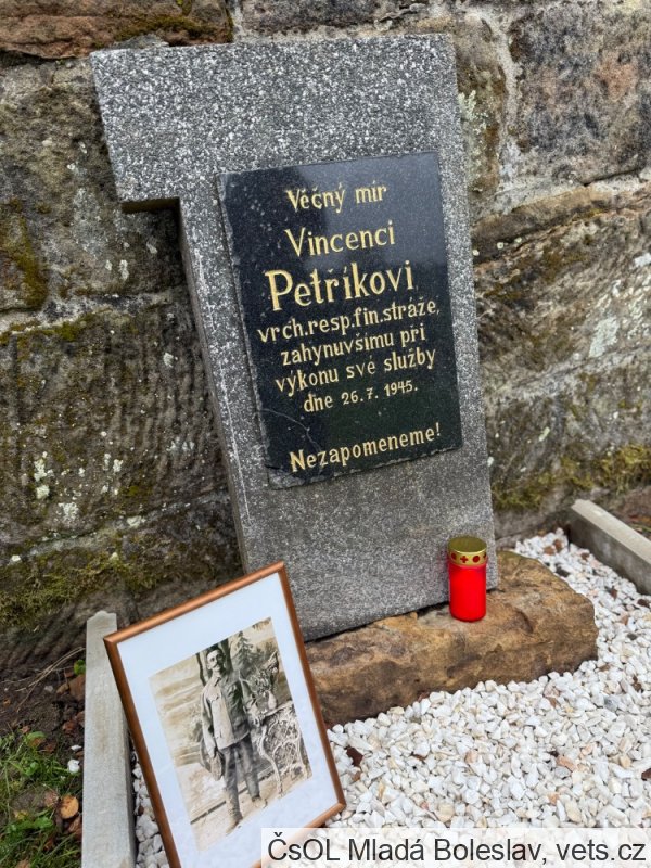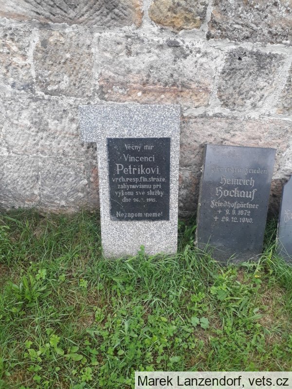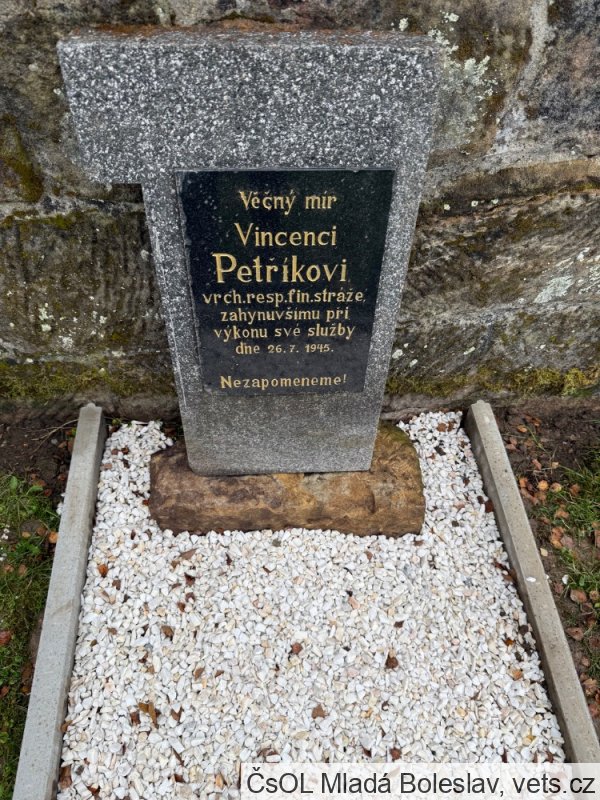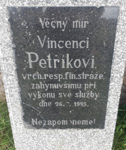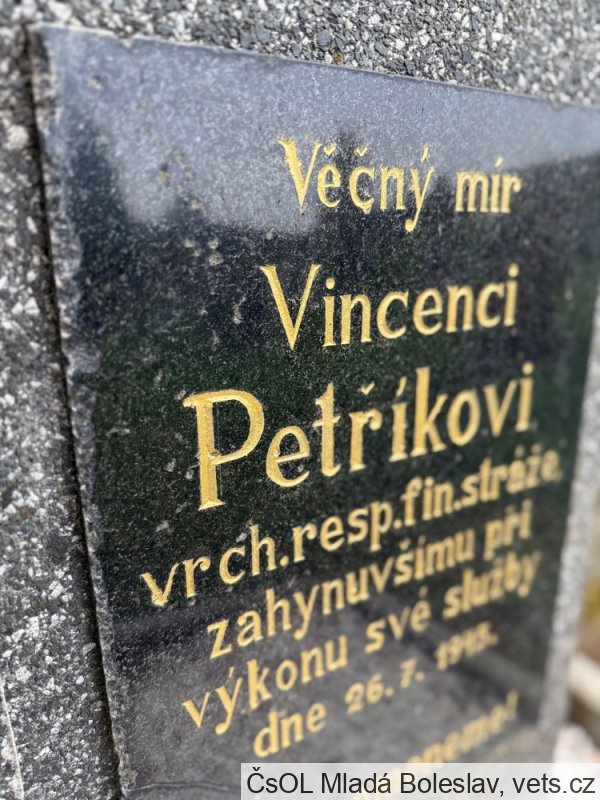 Petřík Vincenc, narozen 16. 8. 1898 Kejnice, okr. Strakonice. Příslušný tamtéž. Zaměstnání krejčí. Prezenční služba u rakousko-uherského útvaru 28. zem. p. pl. Zároveň útvar v době zajetí. Hodnost vojín. Zajetí 19. 8. 1917 Bodres (dnes Bodrež, Slovinsko). Místo podání přihlášky do legií Vittoria. Zařazení do legií 17. 8. 1918. Čs. legie v Itálii. Útvar 31. pěší pluk. Hodnost vojín. Konec v legiích 25. 7. 1921. Poznámka: služba v legii od 17. 8. 1918 do 31. 12. 1919, dne 3. 5. 1920 odešel do finančního kursu v Litoměřicích. Sloužil v Krušných horách, na Děčínsku a poté na Liberecku. Do Krompachu byl přeložen 2. prosince 1936 z Kunratic u Frýdlantu v Čechách. Během služby v Krompachu absolvoval od března do května 1936 s úspěchem i celní kurz pro finanční stráž v Praze. 1938 byl správcem oddělení v Krompachu, kam nastoupil také po osvobození 28. 5. 1945. Dne 26. 7. 1945 nešťastnou náhodou zastřelen.