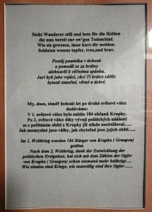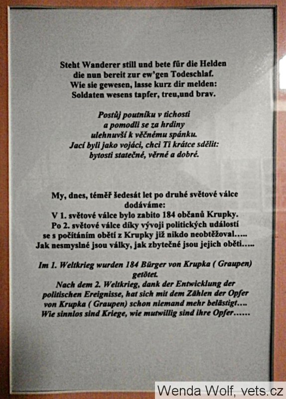 Im 1. Weltkrieg wurden 184 Bürger von Krupka ( Graupen) getötet. Nach dem 2. Weltkrieg, dank der Entwicklung der politischen Ereignisse, hat sich mit dem Zählen der Opfer von Krupka ( Graupen) schon niemand mehr belästigt.... Wie sinnlos sind Kriege, wie mutwillig sind ihre Opfer .