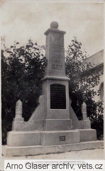 Na historickém foto je za pomníkem vidět část kaple (loď), která byla odstraněna někdy po roce 1953. V tom roce je ještě viditelná na leteckém snímku. Nápisová deska obsahovala 10 jmen. Údaje k některým zjištěným jménům z Radče (Schossendorfu), která mohla být uvedena na pomníku: