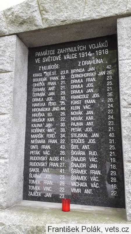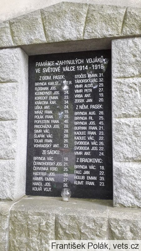 BRYNDA JAN 42, ČERNOHORSKÝ JAN 26, DRMLA FRAN 23, DRMLA JOS. 25, DRMLA JAN 21, FRANCOUZ JOS. 36, FűRST EMAN 20, KLEIN VÁCL. 24, NOVÁK JAN 22, NOVÁK KAR. 24, PAJMA ANT. 23, PETÁK JOS. 21, STEJSKAL JAN 40, STOČES JOS. 31, ŠEFL ANT. 25, ŠKVÁRA RUD. 21, ŠNAJDR VÁC. 19, ŠNAJDR JAN 18, ŠRÁMEK FRAN. 29, ŠRÁMEK VÁC. 28, VACHATA VÁC. 18, VIMR ANT. 22