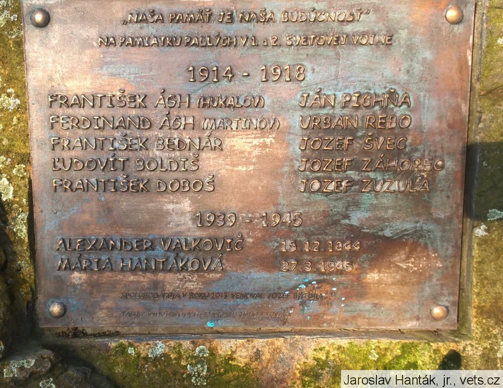 Mária Hantáková, rod. Valkovičová, *26.3.1912, matka dvou malých dětí, †27.3.1945, byla zastřelena německým vojákem schovaným ve stohu slámy, když podávala vodu sovětským vojákům;