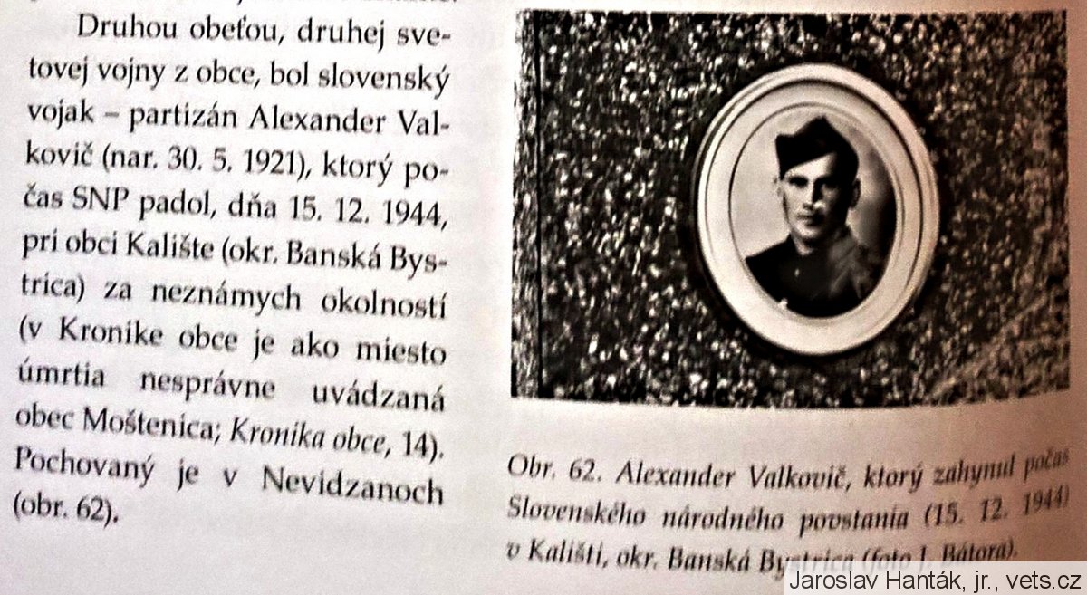 Alexander Valkovič (Válkovič), *30.5.1921, Nevidzany, okr. Zlaté Moravce, národnost-slovenská; kmenové číslo-6.089/M; datum a místo odvodu-17.1.1944, Jefremov; číslo protokolu-10.070;