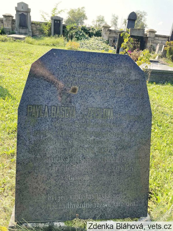 Vdova po kandidátu advokacie zemřela 6. května 1915 v mladistvém věku následujíce s novorozenou dceruškou chotě svého Jaroslava Baše který padl jako poručík 4. bos.herz. pluku na poli cti 2. září 1914 v bitvě u Jezdebna v Ruském Polsku