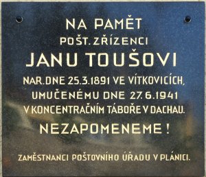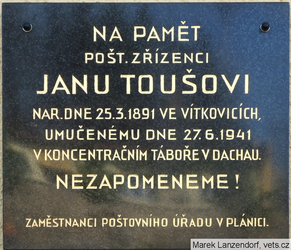 Touš Jan: *25.3.1891 Habartice, okr. Klatovy ( na desce je uvedeno rodištĕ Vítkovice, které jsou od Habartic asi 2 km ). RU armáda: Inft., IR. Nr. 75. Zajetí: 14.8.1916, Josufovka. Zařazení do legie: 24.11.1917. Legie: Čs. legie v Rusku. První útvar v legiích: strážní prapor 2. nem., poslední: 2.nemocnice. Hodnost: vojín. Konec v legiích: 14.8.1920. (zdroj: VÚA)