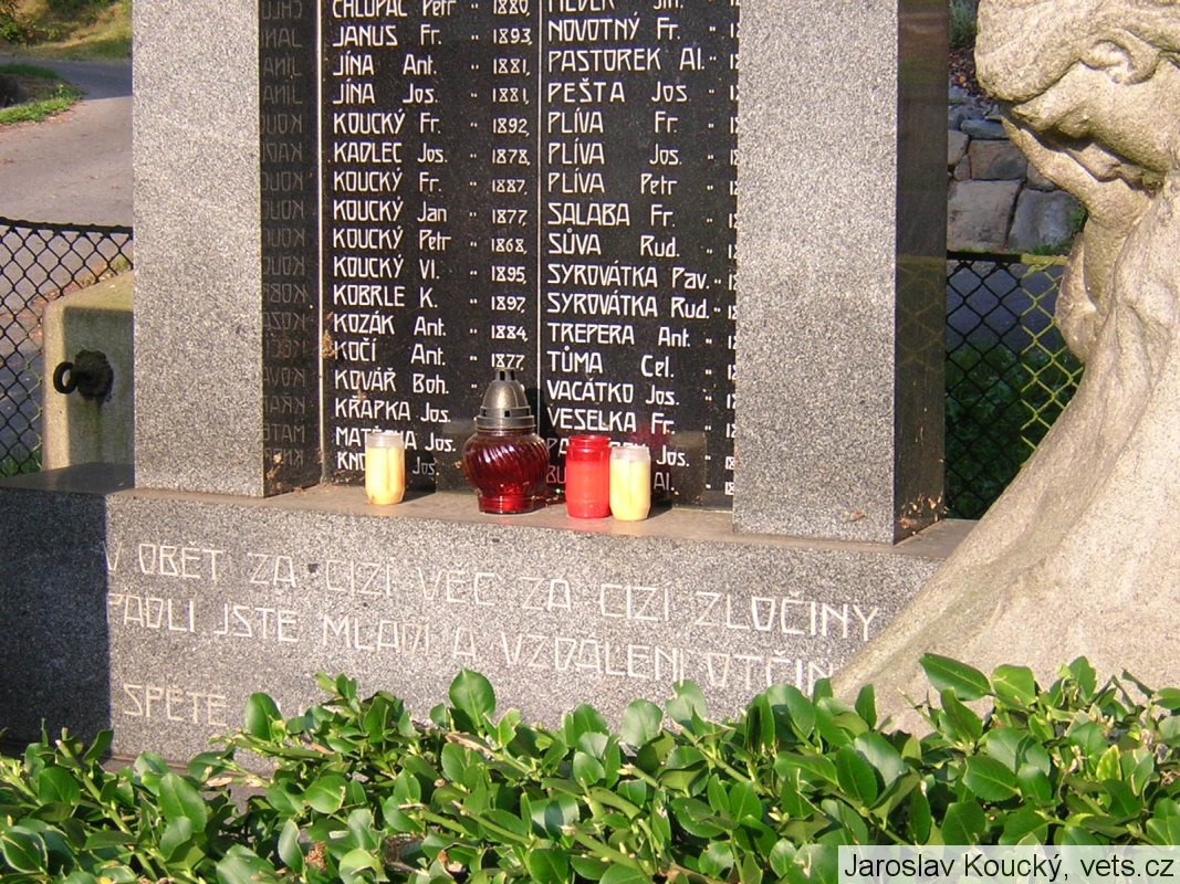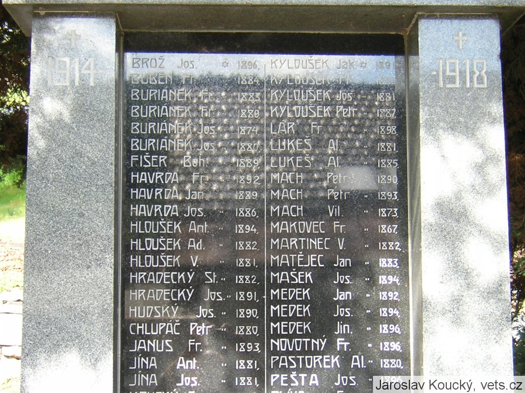 BROŽ JOS. *1896, BUBEN FR. *1884, BURIÁNEK FR. *1883, BURIÁNEK FR. *1880, BURIÁNEK JOS. *1874, BURIÁNEK JOS. *1880, FIŠER JOS. *1889, HAVRDA FR. *1892, HAVRDA JAN 1889, HAVRDA JOS. *1886, HLOUŠEK ANT. 1894, HLOUŠEK AD. *1882, HLOUŠEK V. *1881, HRADECKÝ ST. *1882, HRADECKÝ JOS. *1891, HUDSKÝ JOS. *1890, CHLUPÁČ PETR *1880, JANUS FR. *1893, JÍNA ANT. *1881, JÍNA JOS. *1881, KOUCKÝ FR. *1892, KADLEC JOS. *1878, KOUCKÝ FR. *1887, KOUCKÝ JAN *1877, KOUCKÝ PETR *1868, KOUCKÝ VL. *1895, KOBRDLE K. *1897, KOZÁK ANT. *1884, KOČÍ ANT. *1877, KOVÁŘ BOH. *1899, KŘAPKA JOS. *1893, MATĚCHA JOS. *1896, KNOP JOS. 1890
