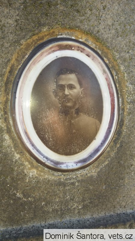 Fotografie vojáka v rakousko-uherské uniformě, asi podporučík (?). Text nečitelný, byl v českém jazyce. Haklovy Dvory, německy Habern, místní část Českých Budějovic, byly do roku 1945 národnostně smíšená vesnice.