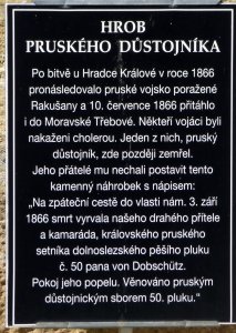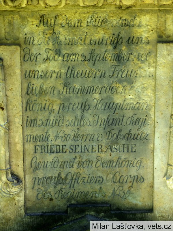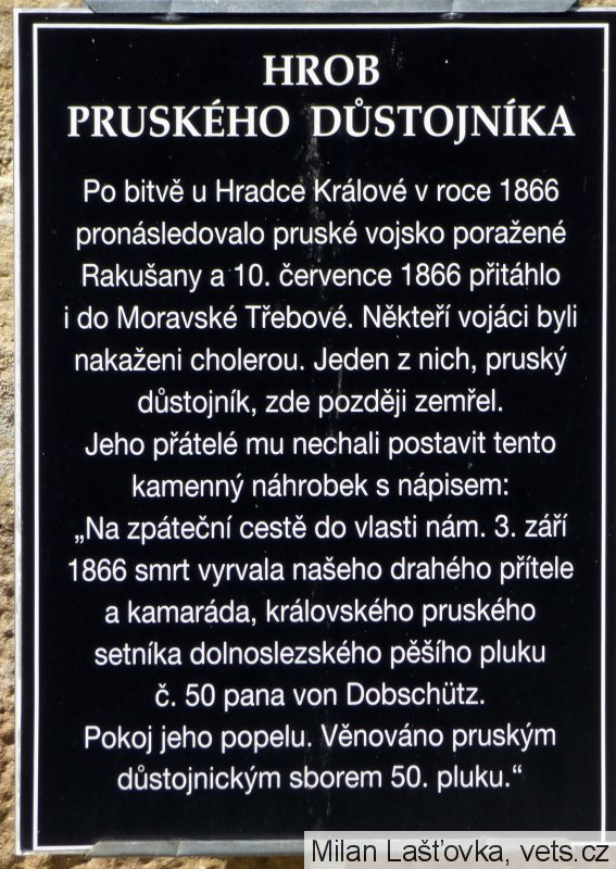 Po bitvě u Hradce Králové v roce 1866 pronásledovalo pruské vojsko poražené Rakušany a 10. července 1866 přitáhlo i do Moravské Třebové. Někteří vojáci byli nakaženi cholerou. Jeden z nich, pruský důstojník, zde později zemřel. Jeho přátelé mu nechali postavit tento kamenný náhrobek s nápisem: „Na zpáteční cestě do vlasti nám. 3. září 1866 smrt vyrvala našeho drahého přítele a kamaráda, královského pruského setníka dolnoslezského pěšího pluku č. 50 pana von Dobschütz. Pokoj jeho popelu. Věnováno pruským důstojnickým sborem 50. pluku."