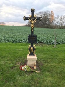 Dne 28.10.2017 byla v místě dopadu pumy vztyčena Boží muka a vysvěcena jako památník této lidské tragédie v samém konci války.