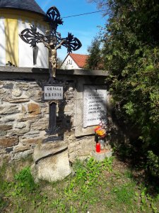 Umístění: Vilémovice, střed obce, v ohradní zdi hřbitova s kostelemNápis: