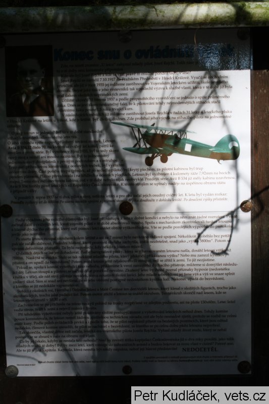 Zde, na místě zvaném U Letce zahynul mladý pilot, Josef Rejchl. Tolik nám poví pomníček, který tu od té doby katastrofu připomíná.