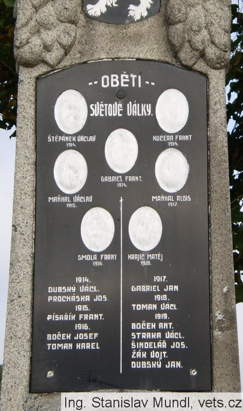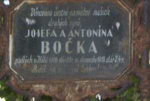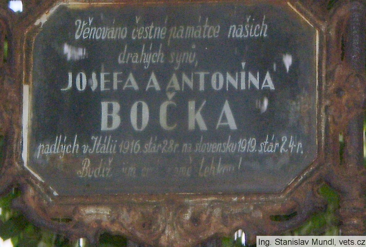 Věnováno památce našich synů Josefa a Antonína Bočka padlých v Itálii 1916, stár 28 r., na Slovensku 1919, stár 24 r.