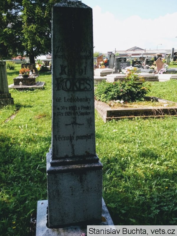 Karel Kokeš začal v této bance pracovat. Byl vyslán i do Chorvatska, kde pracoval v pobočce této banky. Po čase se vrátil do pražské centrály. Ale následky z války u něho zanechaly zdravotní stopy. Na jaře roku 1929 byl vyslán na léčení do Vysokých Tater. Po cestě se zastavil ve své rodné obci. Můj bratranec jako šestiletý si na tuto jeho poslední návštěvu rodné obce pamatoval. Po několika hodinách pokračoval vlakem do Tater. V Tatrách v Novém Smokovci dne 22.5.1929 jako 39 letý, svobodný, zemřel. Protože v Novém Smokovci nebyl hřbitov, byl pohřben v nedalekém Veľkém Slavkově. Při svojich cestách po Slovensku jsem koncem devadesátých let minulého století místní hřbitov navštívil. Hrob jsem našel, pomník byl zašlý a nápisy málo viditelné. S bratrancem jsme se rozhodli, že ho necháme zrenovovat a opravit. Oslovil jsem v Popradu kamenářskou firmu a nechal jsem v roku 2000 pomník přebrousit a obnovit původní nápisy. Přikládám fotografie původního pomníku a opraveného.
