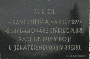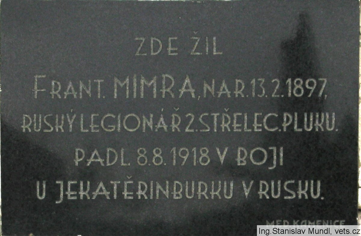 František Mimra, nar. 13.2.1897 Bohdalín okr. Kamenice nad Lipou. V RU armádě sloužil u 75. pěšího pluku jako vojín. Zajat 19.7.1917, Zborov. Do čs. legií v Rusku se přihlásil v Darnici, zařazen 3.7.1917 jako vojín k záložnímu praporu. Padl 8.9.1918 u Jekaterinburku v boji proti bolševikům jako vojín 2. střeleckého pluku.