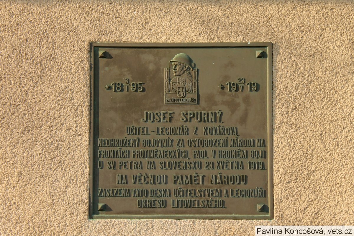 Dne 11. Června 1936 prožíval Kovářov s okolím nezapomenutelnou slavnost, kdy byla odhalena na zdejší obecné škole pamětní deska učiteli, legionáři, kapitánu Josefu Spurnému. Josef Spurný se narodil 3. ledna 1895 v maličkém domku v Nové Vsi u Litovle. S rodiči se zakrátko odstěhoval do Nových Polí, kde byl jeho otec na chudobínském panství hajným. Chodil do obecné školy ve Vilémově a vystudoval reálku v Litovli. Po maturitě vstoupil do abiturenského kursu v Přípoře. Dne 1. října 1913 byl ustanoven učitelem v Ludvikovicích u Luhačovic, od 4. dubna 1914 vyučuje v Litovli a od 16. ledna 1915 byl pověřen správcem školy v Ospělově. Dne 8. března je odveden a nastupuje válečnou službu již 15. března. Sloužil u 13. P. pl. v Olomouci. Zajat byl 21. července 1916 u Dubna a 7. srpna 1917 psal z Tjumenu ze Sibiře, že vstoupil do legie. Byl u 7. Tatranského pluku. Bojoval v Rusku, ve Francii u 22. pluku a v Itálii u 35. pluku. S tímto plukem se vrací do vlasti – leč bojuje na Těšínsku a Slovensku. Poslední dopis píše 19. května 1919 a již 23. května 1919 ráno v 7 hodin padá v hrdinském boji u Sv. Petra (u Miškovec), byl střelen do srdce Maďarem. Pohřben byl nejdříve v Košicích (25. 5.) a 25. listopadu 1919 převezen otcem do Měrotína na hřbitov.