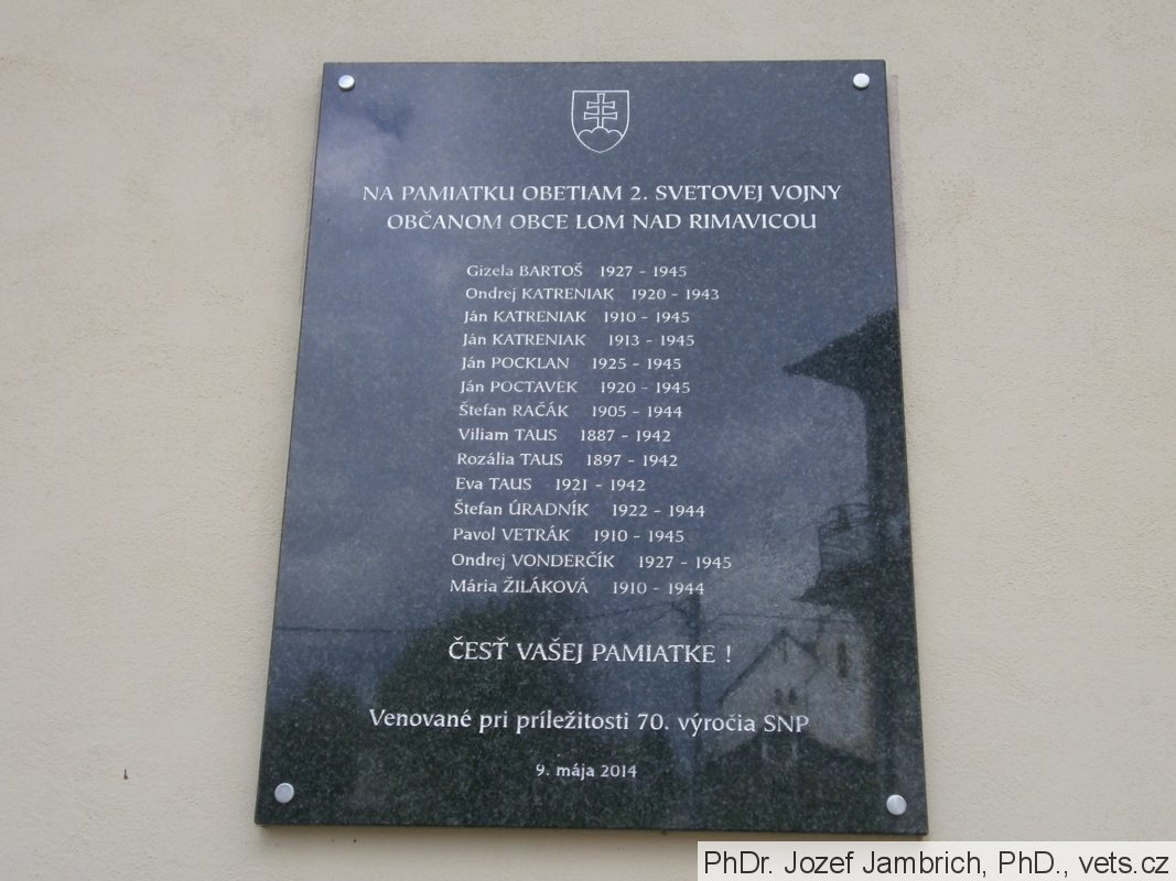 Umístění: Lom nad Rimavicou, stred obce, na budove Obecného úradu Lom nad Rimavicou, č. 13NA PAMIATKU OBETIAM 2. SVETOVEJ VOJNY