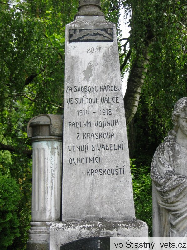 ZA SVOBODU NÁRODU VE SVĚTOVÉ VÁLCE 1914 - 1918 PADLÝM VOJÍNŮM Z KRASKOVA VĚNUJÍ DIVADELNÍ OCHOTNÍCI KRASKOVŠTÍ